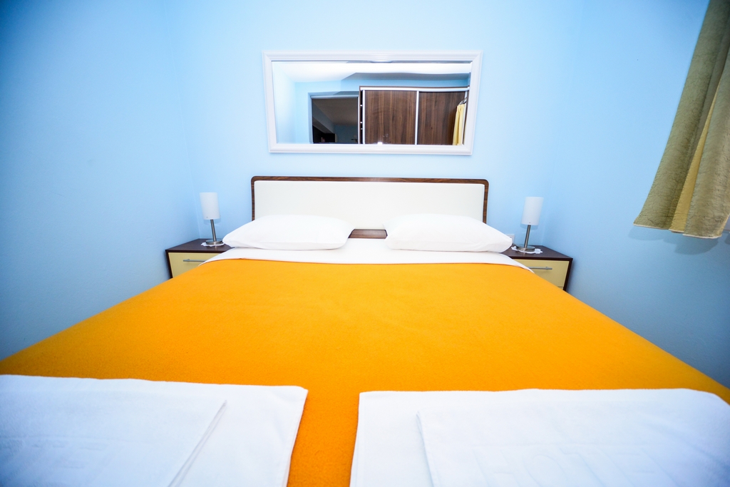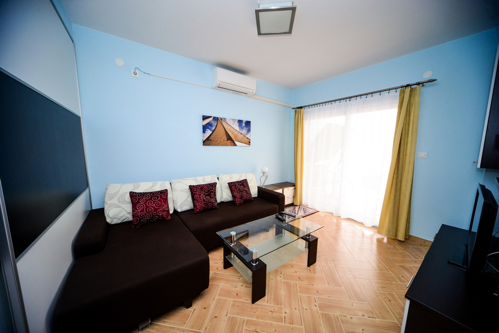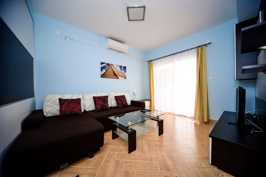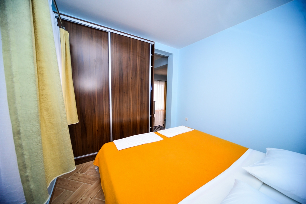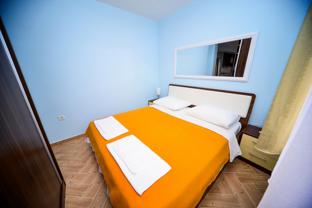 This standard apartment is on the first floor. It contains one double bed for two persons, kitchen, a large cabinet, WC with shower cabin, a 30m2 balcony, air conditioner, LCD TV, SAT TV.