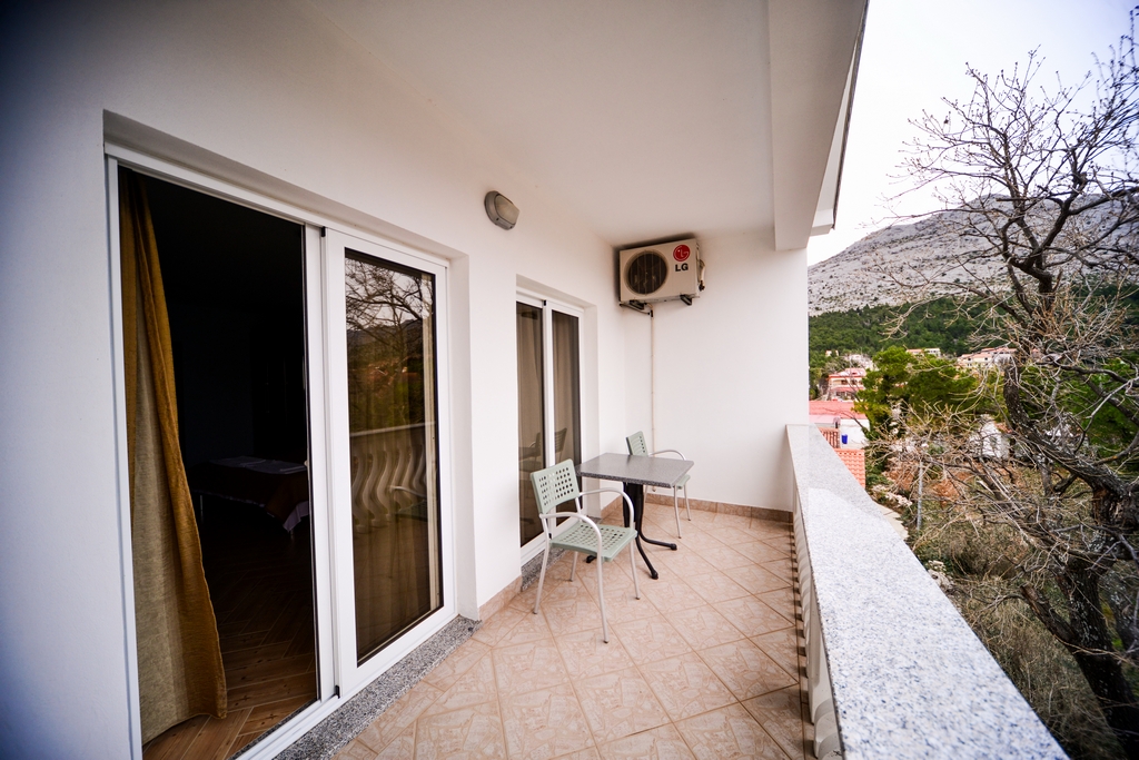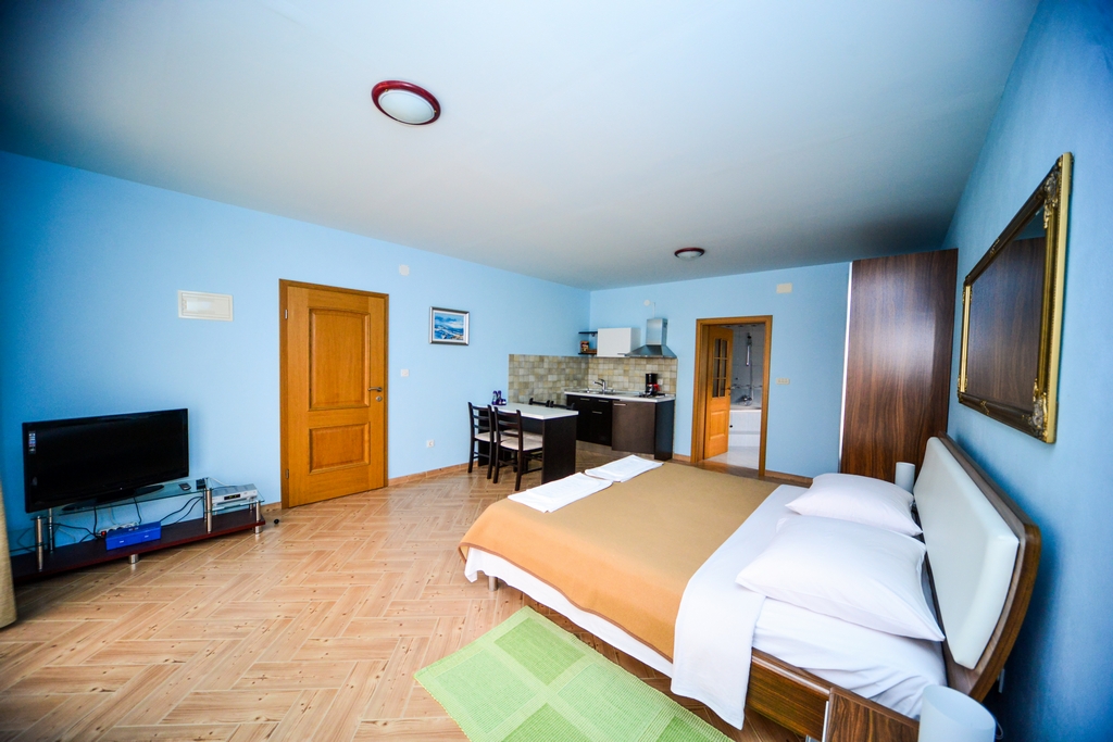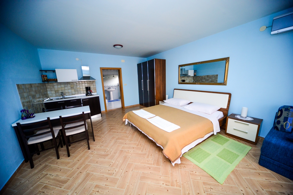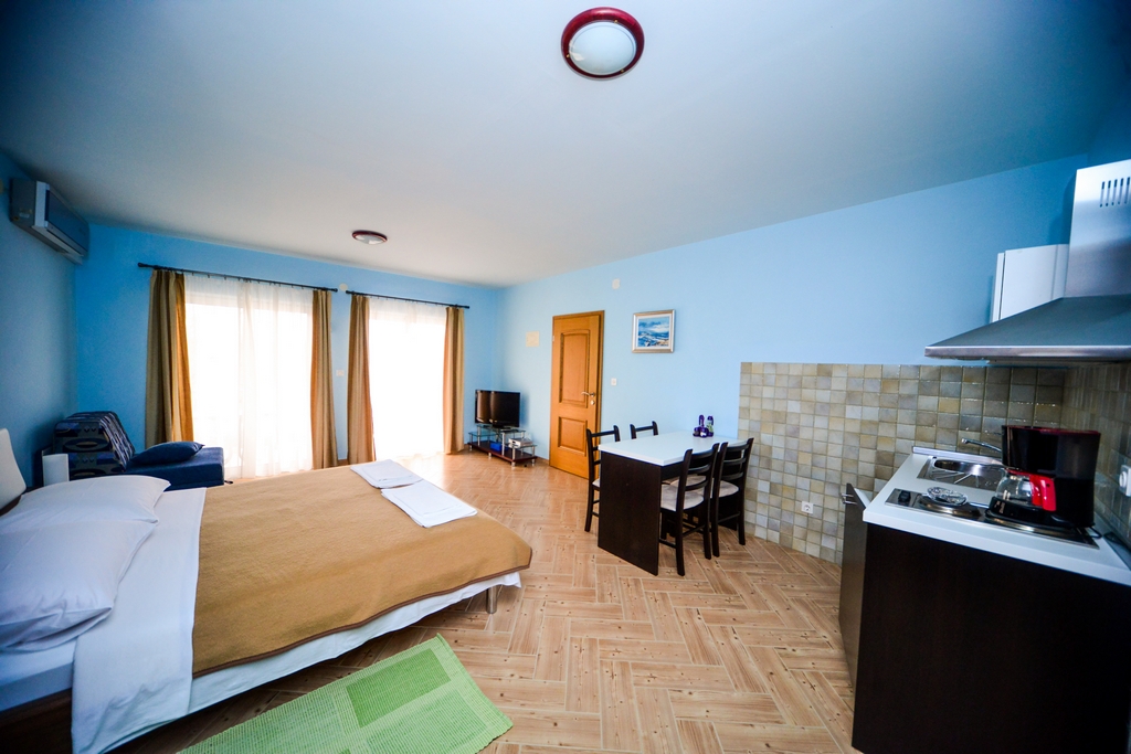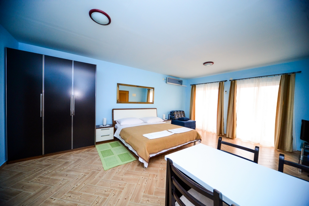 This studio apartment is on the second floor. His size is 42 m2. It contains one double bed for two persons, kitchen, a large cabinet, WC with shower cabin, a 9 m2 balcony, air conditioner, LCD TV, SAT TV.