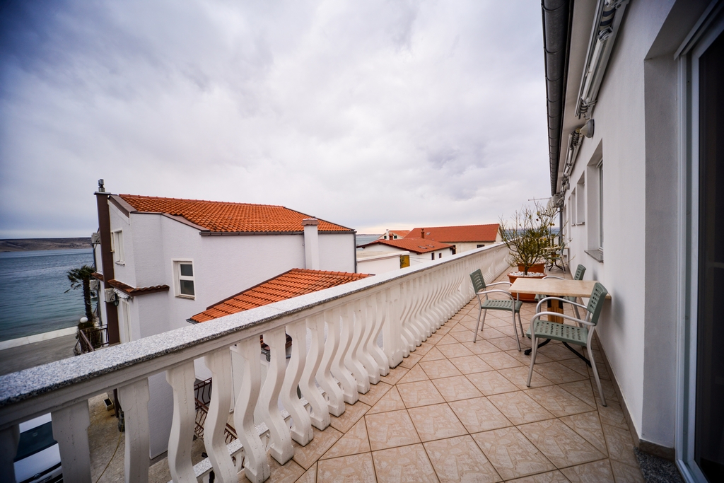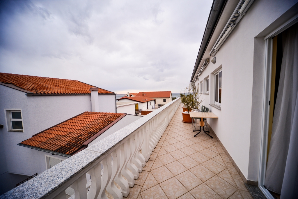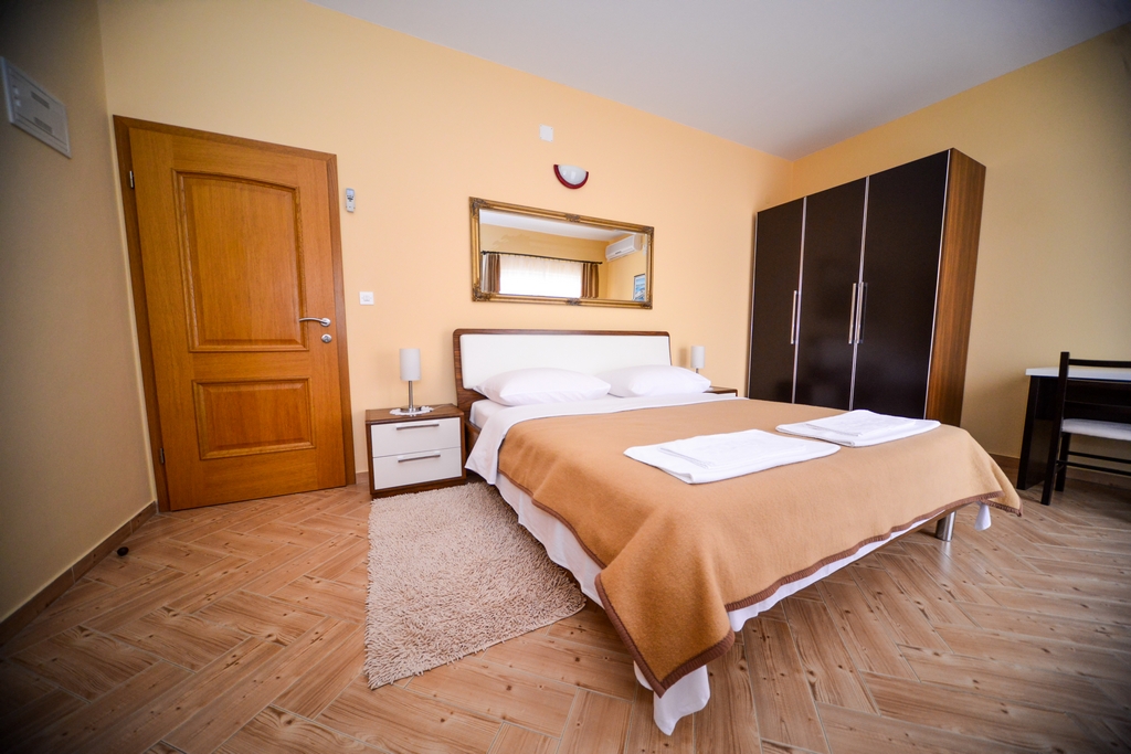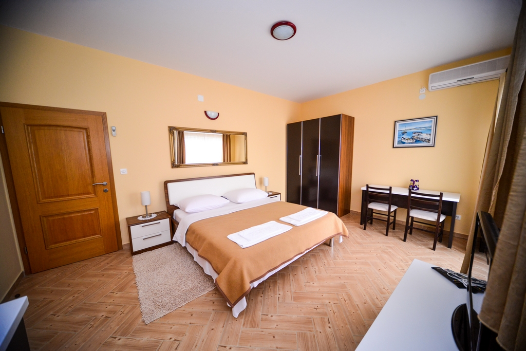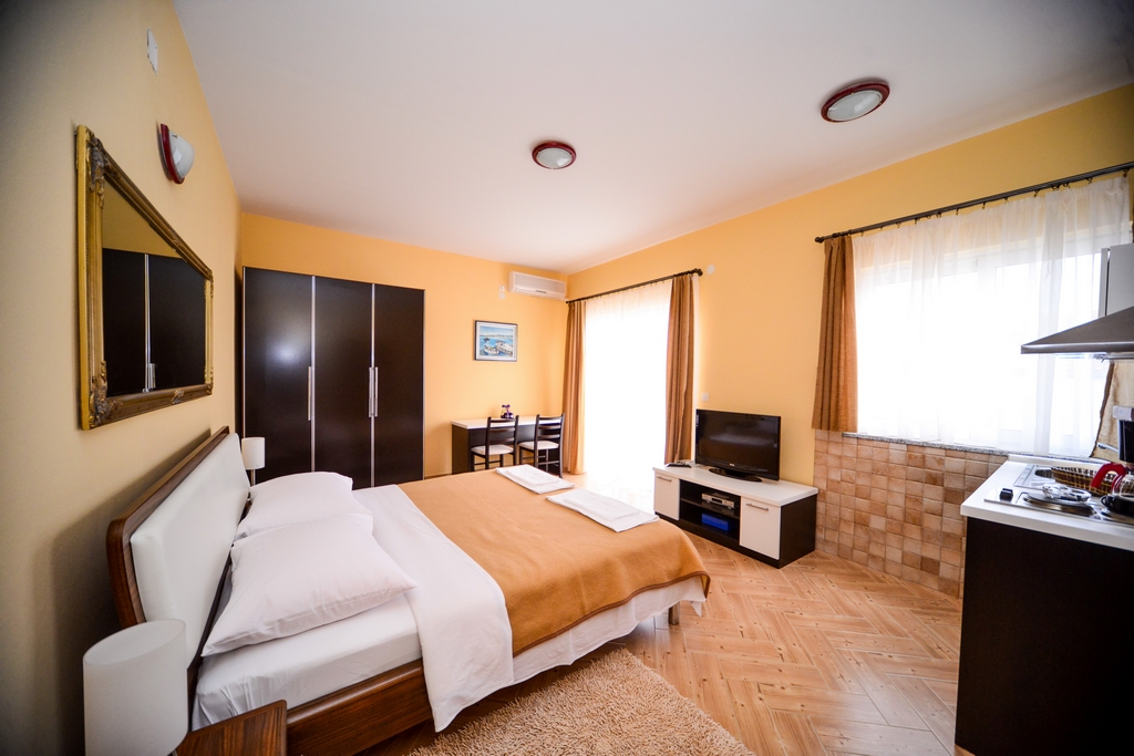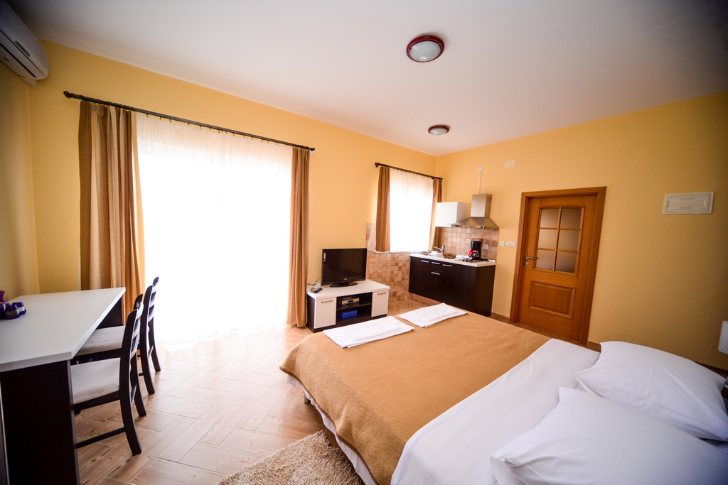 This studio apartment is also on the second floor. His size is 28 m2. It contains one double bed for two persons, kitchen, a large cabinet, WC with bath, a 14 m2 balcony, air conditioner, LCD TV, SAT TV.